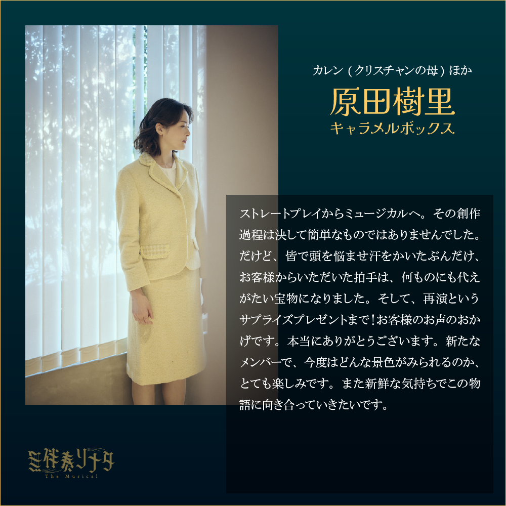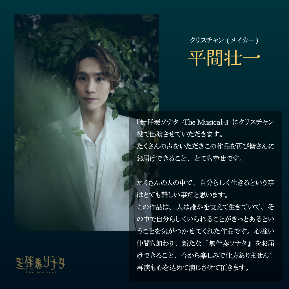 音楽の天才として見入だされるクリスチャンには、『RENT』、『ヴァグラント』、『イン・ザ・ハイツ』などの話題作に出演が続く、平間壮一。クリスチャンの生活を監視するウォッチャーには、舞台版『無伴奏ソナタ』でクリスチャンを演じてきた多田直人(キャラメルボックス)。そして、ほかキャストに、宝塚歌劇団男役、そして劇団四季『ウィキッド』のグリンダ役や『ゴースト&レディ』のフロー役を経て、今後の活躍に期待が集まる真瀬はるか、『レ・ミゼラブル』に最年少コゼット役でデビューし、『笑う男』デア役、『キンキーブーツ』ニコラ役など、ミュージカル界を担う若手の1人熊谷彩春、ミュージカル『ヘタリア』シリーズで主演を務め、舞台『文豪ストレイドッグス』などの人気作に出演、ミュージカル『マタハリ』ピエール役など俳優として着実に成⻑を続ける⻑江崚行、『ミス・サイゴン』トゥイ役、『ビリー・エリオット』トニー役、こまつ座『泣き虫なまいき石川啄木』ほか、YouTube《クロネコチャンネル》を立ち上げ、クリエイターとしても活躍する⻄川大貴、阿佐ヶ谷スパイダースのメンバーでもあり、『ロミオ&ジュリエット』マーキューシオ役、『next to normal』ヘンリー役、など、幅広い役柄に挑み続ける俳優、大久保祥太郎らが出演。どうぞご期待ください。